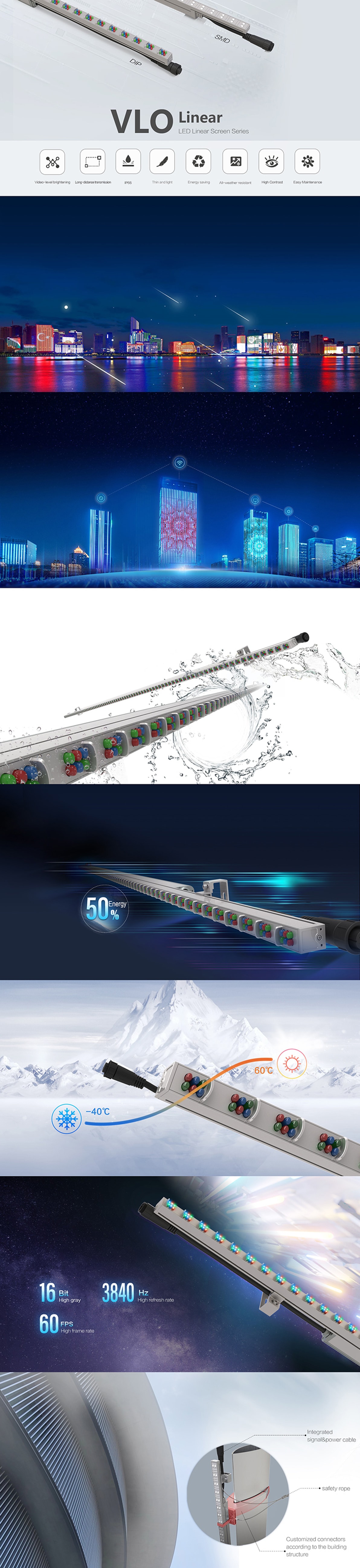 7.無(wú)需鋼結(jié)構(gòu),可從前安裝與維護(hù),單燈條只需少量構(gòu)件即可輕松貼于墻面,無(wú)需鋼結(jié)構(gòu),安裝空間只需33mm,適應(yīng)各種類(lèi)型的建筑