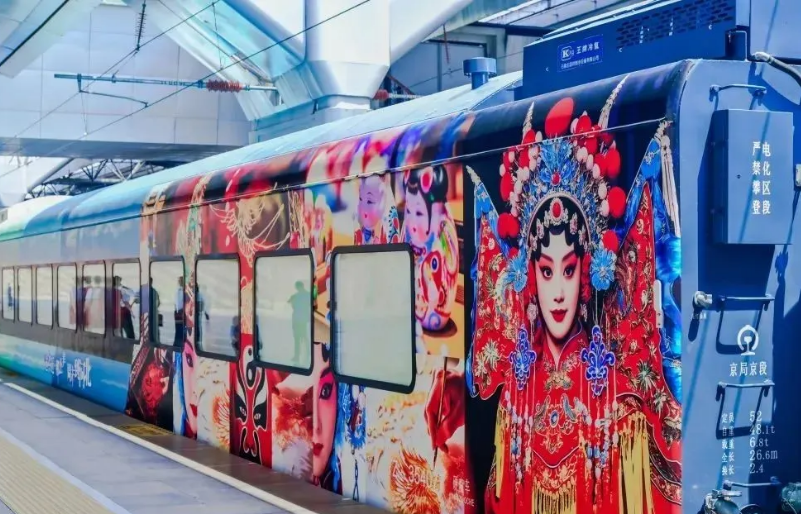 “星光·燕趙號”以“移動文化空間”為核心理念,集觀光、餐飲、娛樂于一體,將河北大地的自然詩意融入車廂,實(shí)現(xiàn)從“交通工具”向“移動觀景客廳”華麗蛻變。外觀采用藍(lán)色漸變色系設(shè)計(jì),融入京劇等傳統(tǒng)藝術(shù)圖案、北京河北古建筑紋樣和京津冀協(xié)同發(fā)展的現(xiàn)代圖景等元素,通過差異化視覺敘事共同構(gòu)建起流動的文化長廊。