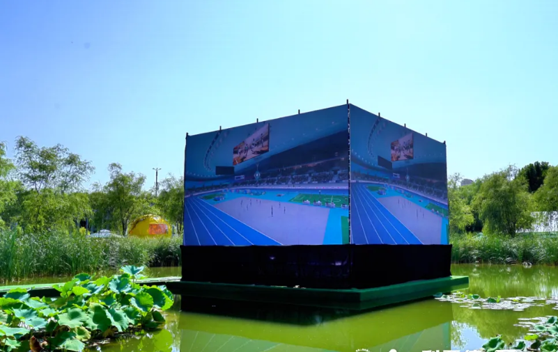 在湖心島生態(tài)區(qū),利亞德通過將L型折疊屏與園林造景融合,構(gòu)建起“科技+自然+人文”三位一體的創(chuàng)新體驗場,將賽場上機(jī)器人的精彩表現(xiàn)清晰地展示在游客面前,為游客帶來了一種全新的游覽感受。